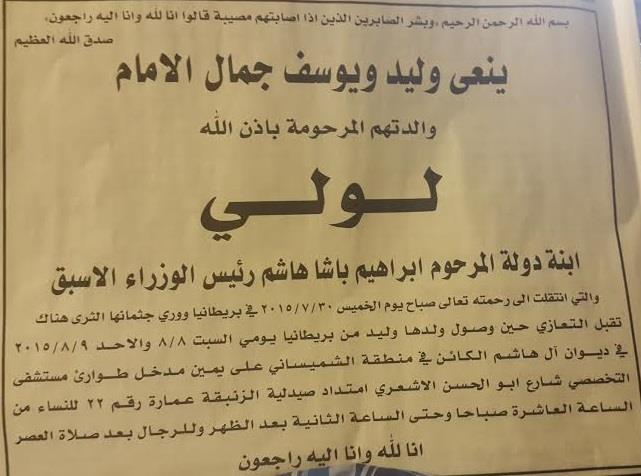 عمون - انتقلت الى رحمة الله تعالى لولي ابنة رئيس وزراء الاردن ابراهيم هاشم .
