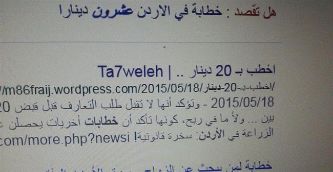 معقول؟هل يوجد بالاصل خطابات في الاردن مقابل مبلغ مادي؟شعرت و انا أقرأ هذا الاعلان كانني لست من بنات هذا البلد, الفتاة الاردنية التي يدوخ الرجل الى حين موافقتها على الزواج منه ,و يصبح شبيها لخيالها و يبعث لها الورود و الهدايا السرية عسى بأن يحالفه الحظ بالارتباط بها للأسف اصبح ثمنها عشرين دينارا أردنياً فقط " يا بلاش " ,الرجل الاردني الكشور "اللي ما بعجبه العجب,واللي بدو بنت باربي و أهم نقطة صحبة مع أمه و ابوه كأنهم أهلها وزياده" ببساطة تريد هذه المرأة بأن تربطه ربطة لا يعلم بها الا الله,بفتاة لا يعلم اصلها من فصلها من وضعها من تعليمها من اخلاقها, فقط "المهم يتزوج و السلام" و الذي تعجبت منه اكثر بأن يوجد الكثيرين من العرسان مدونين تحت الخانة الاجتماعية "متزوج" ,"الله أكبر ,ضاقت عينكم على زيجة الانترنت؟" انني لم أكن أعلم بأن هنالك مثل هذه الأساليب الجاهلة الا في المسلسلات الدرامية السورية فقط, لكن الحقيقة تكمن لحظة كتابتك لكلمة "خطّابات في الأردن" فما أن تظهر العديد و العديد من الاعلانات والعروض "اللي بتسم البدن" بالفعل.