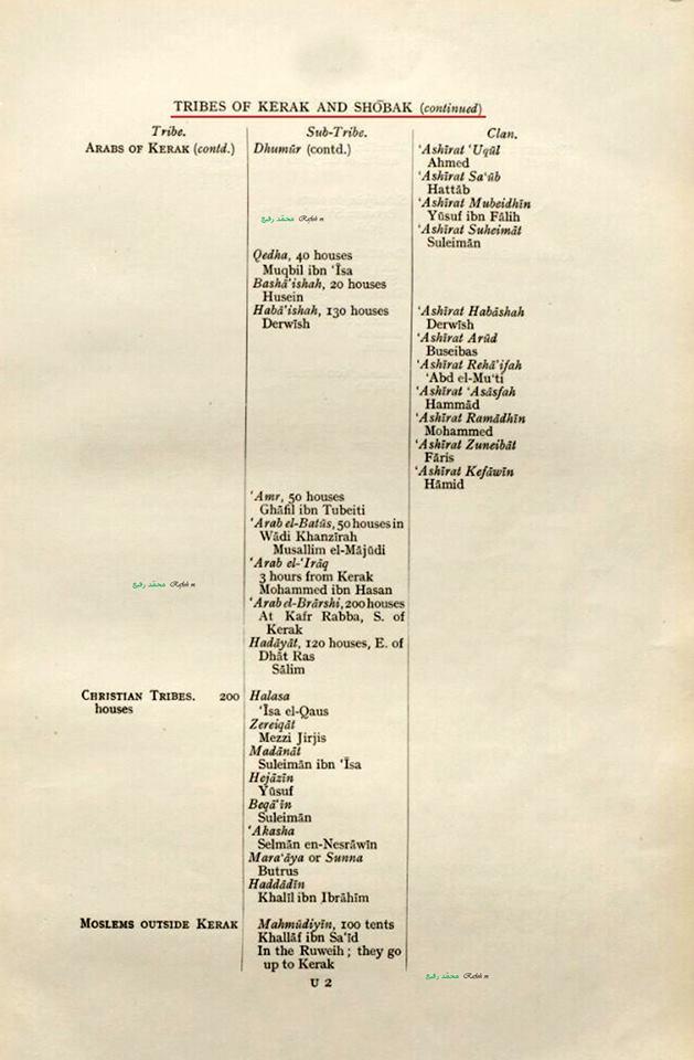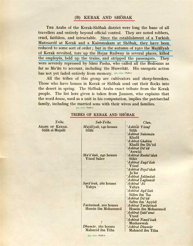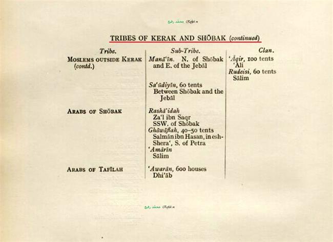 عمون - كتب المؤرخ الاردني الكبير محمد رفيع مادة وثائقية حول قبائل وعَشائر الكرك والشوبك والطفيلة وبيوتها وشيوخها عام 1917 من خلال (وثائق استخباريّة بريطانيّة سريّة نادرة جدّاً _ مكتب الهند) وجاء فيها :