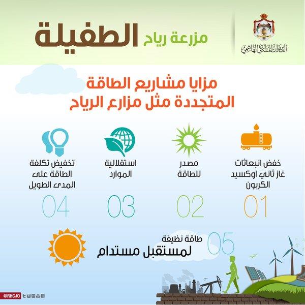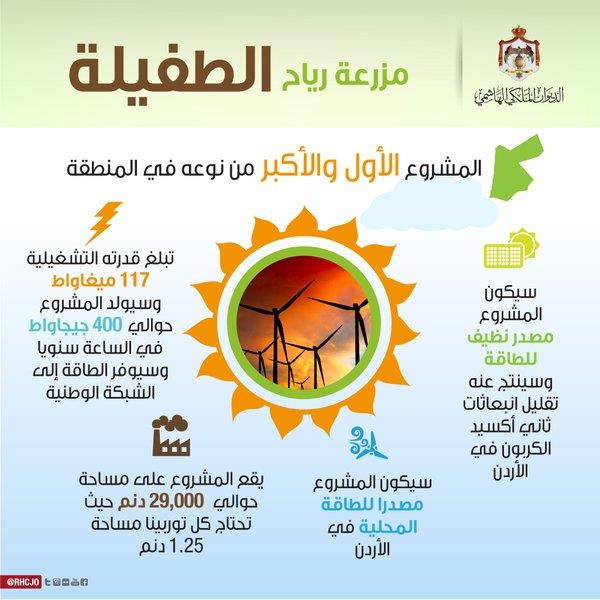 وكانت شركة رياح الأردن وضعت حجر الأساس للمشروع في نيسان 2014، وأتمت في آب من العام الحالي المرحلة الإنشائية له، واختارت الطفيلة لإقامته لتميزها عن باقي محافظات ومناطق المملكة من حيث سرعة واتجاه الرياح.