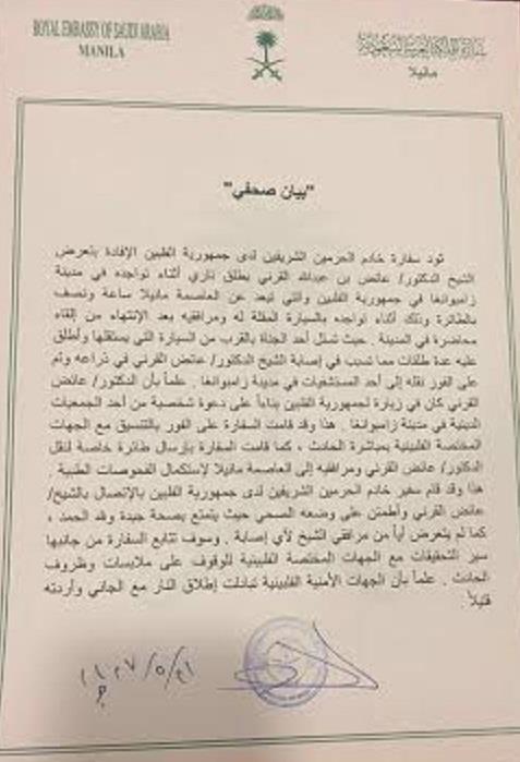 وبحسب البيان فإن الدكتور عائض القرني، كان في زيارة لجمهورية الفيليبين، بناءً على دعوة شخصية من إحدى الجمعيات الدينية في مدينة زامبوانغا.