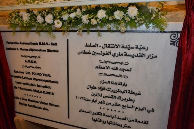 عمون- تراس بطريرك الكنيسة اللاتينية في القدس غبطة البطريرك فؤاد الطوال في كنيسة انتقال السيدة للاتين في السلط تدشين المزار الوحيد للام القديسة ماري الفونسين ، في المكان الذي كانت فيه اول ارسالية رهبانية خدمت لمدة سنتين، في اول مدرسة في الاردن لمدارس البطريركية اللاتينية.