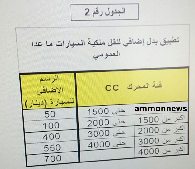 كما كشف العناني انه سيتم رفع رسوم نقل الملكية للسيارات المستعملة. حيث ستكون خمسين دينارا للمركبات التي تصل سعة محركها 1500 سي سي، ومئة دينار للمركبات ذات سعة المحرك 1500 -2000 سي سي ، و400 دينار للمحركات بين 2000 -3000 سي سي و500 دينار للمحركات 3000 -4000 سي سي، و600 دينار لما فوق..كما قررت الحكومة إلغاء قرار تخفيض الجمارك وضريبة المبيعات على الملابس والأحذية.وتتضمن الاجراءات زياد