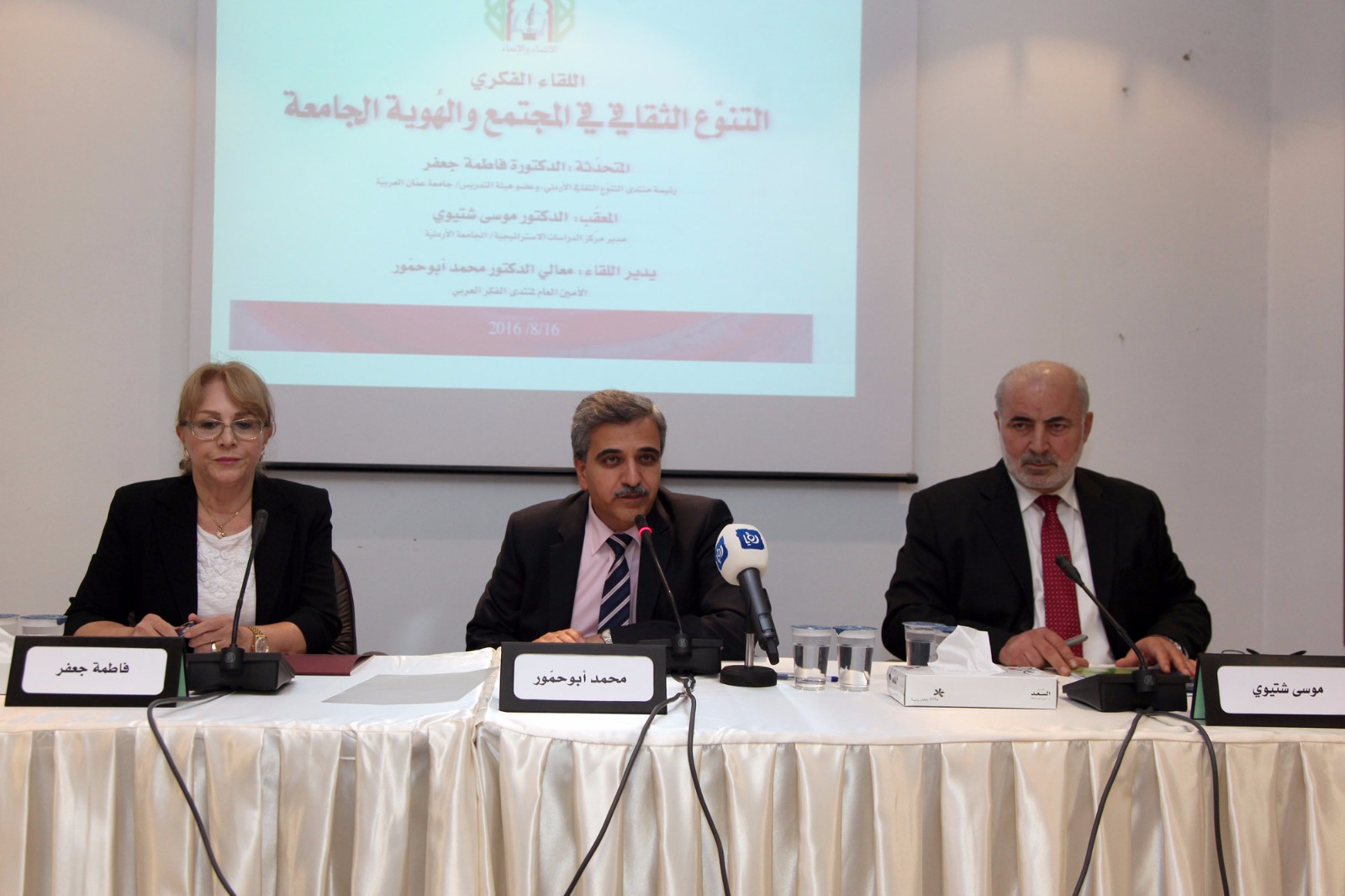 عمون- ضمن سلسلة اللقاءات الفكرية لمنتدى الفكر العربي، عُقد مساء الثلاثاء 16/8/2016 لقاء بعنوان "التنوع الثقافي في المجتمع والهوية الجامعة"، حاضرت فيه الدكتورة فاطمة جعفر رئيسة منتدى التنوع الثقافي الأردني وعضو هيئة التدريس في جامعة عمّان العربية، وعقّب على المحاضرة الدكتور موسى شتيوي مدير مركز الدراسات الاستراتيجية في الجامعة الأردنية، وأدار اللقاء الدكتور محمد أبو حمور الأمين العام لمنتدى الفكر العربي، بحضور أكاديميين وممثلي هيئات من المجتمع المدني ودبلوماسيين وكُتّاب وإعلاميين.