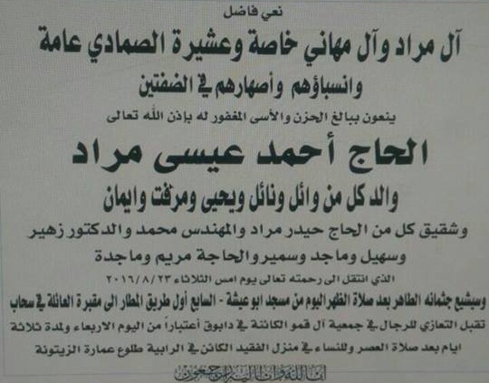 تتقدم لشخصكم الكريم خاصة ولآل مراد الكرام عامة بأصدق مشاعر العزاء والمواساة بفقيدكم المرحوم عمكم احمد عيس مراد أبو وائل