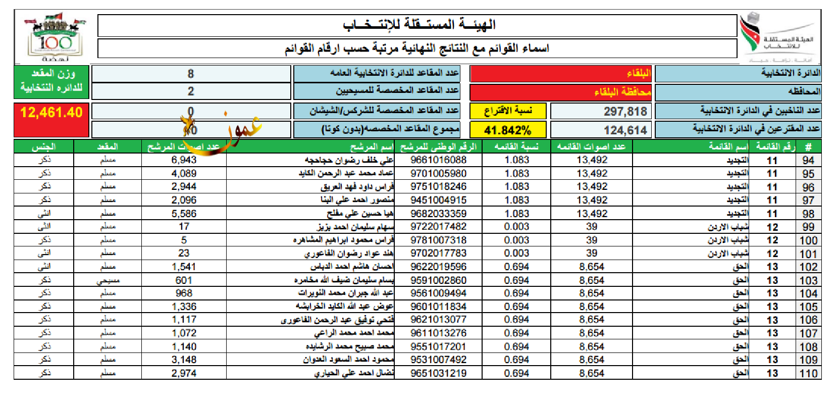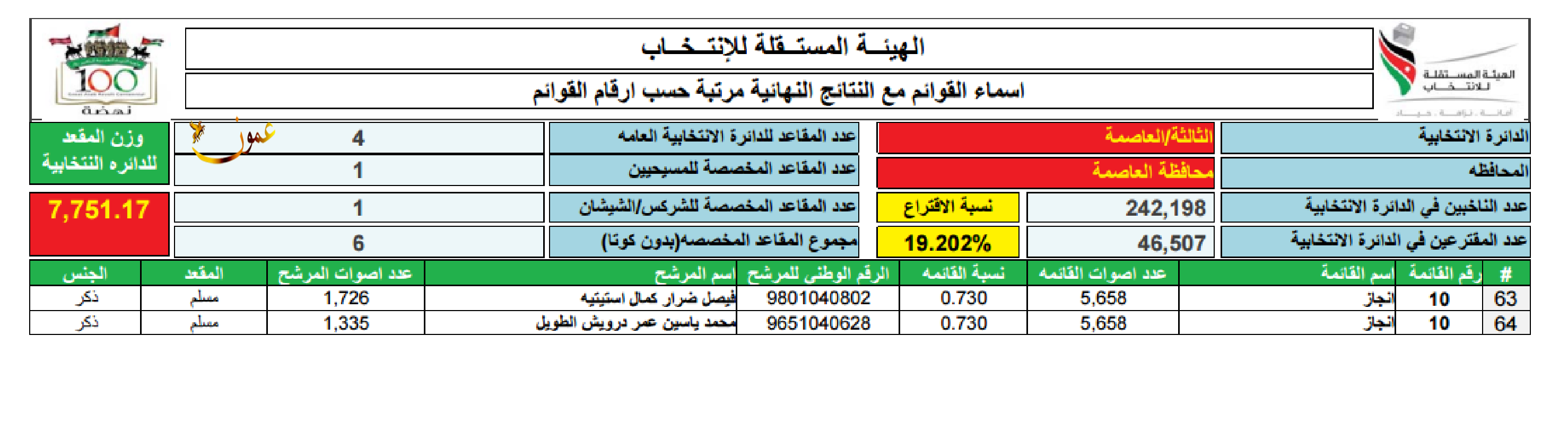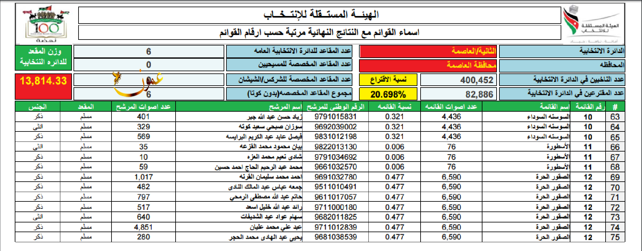 عمون - تنشر عمون النتائج النهائية الرسمية للانتخابات النيابية 2016 ، والتي تتضمن أسماء جميع القوائم مع النتائج النهائية مرتبة حسب رقم القائمة وعدد الأصوات التي حصلت عليها كل قائمة وكل مرشح سواء كان فائزاً أم لا ، والقوائم الفائزة وعدد المقاعد لكل منها ، وأسماء الفائزين بمقاعد تلك القوائم وعدد الأصوات التي حصلوا عليها وأسماء الفائزات بالمقاعد الاضافية المخصصة للنساء. |