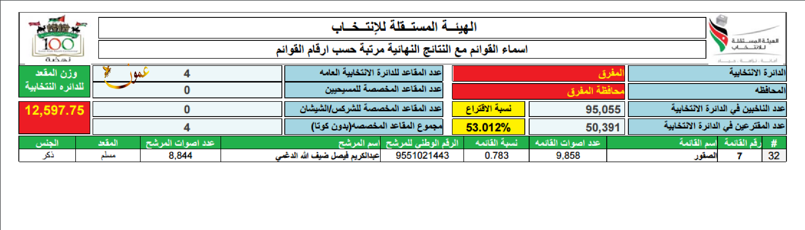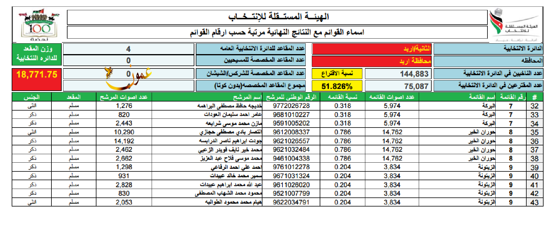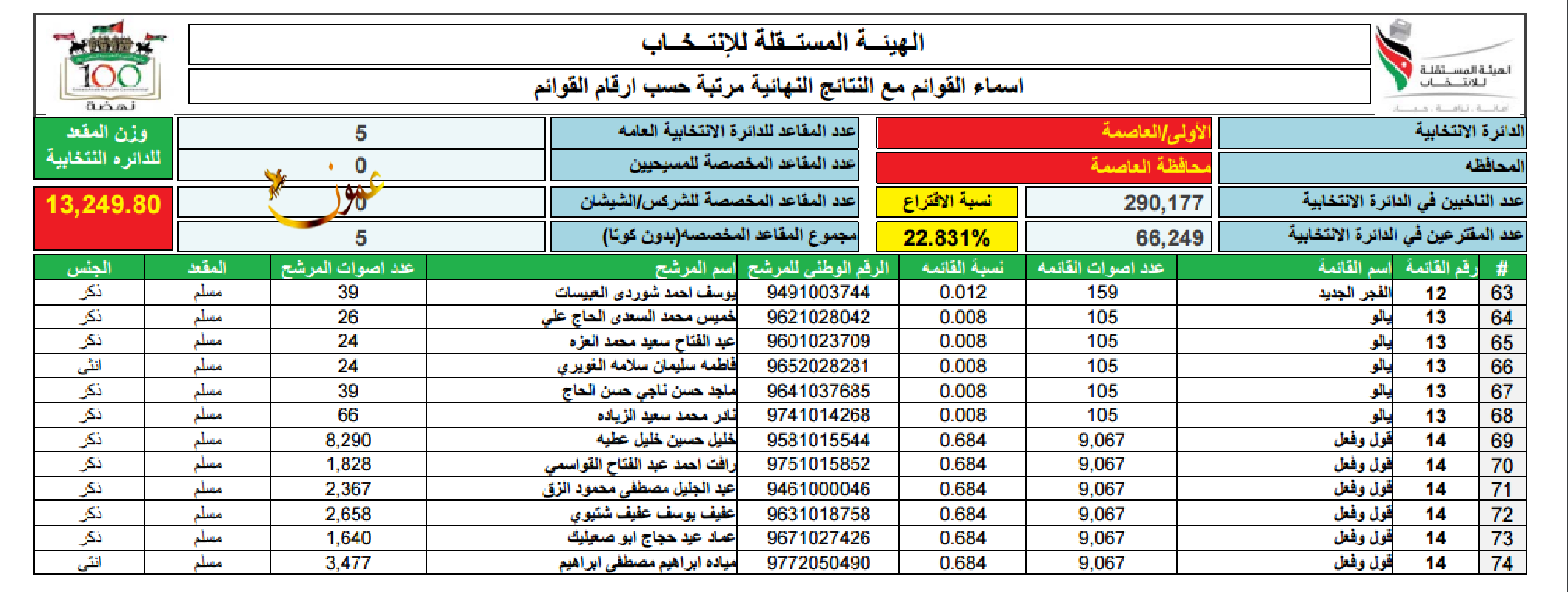 عمون - تنشر عمون النتائج النهائية الرسمية للانتخابات النيابية 2016 ، والتي تتضمن أسماء جميع القوائم مع النتائج النهائية مرتبة حسب رقم القائمة وعدد الأصوات التي حصلت عليها كل قائمة وكل مرشح سواء كان فائزاً أم لا ، والقوائم الفائزة وعدد المقاعد لكل منها ، وأسماء الفائزين بمقاعد تلك القوائم وعدد الأصوات التي حصلوا عليها وأسماء الفائزات بالمقاعد الاضافية المخصصة للنساء. |