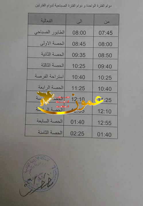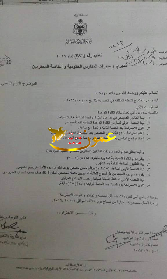 عمون - ينال المعاني - اصدرت مديريات التربية في وزارة التربية والتعليم تعميم رقم 386 لعام 2016 لمديري ومديرات المدارس الحكومية والخاصة بتعديل اوقات الدوام الرسمي بناء على اجتماع اللجنة المكلفة في المديرية بتاريخ 10/ 10 وعلى النحو التالي :