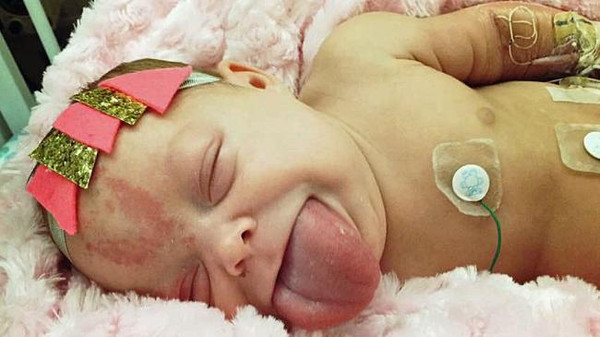 وتروي والدة الطفلة، واسمها ماديسون وهي في الـ21 من عمرها، أن لسان الطفلة كان خارج فمها ويصعب ابتلاعه للداخل، وكانت تمضغه باستمرار، حيث إنه كان يأخذ مساحة كبيرة من تجويف الفم. كذلك كانت تعابير وجهها غير مريحة بسبب ذلك الوضع.