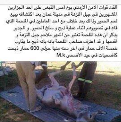 عمون – رداد القلاب - نفى مصدر أمني ما تم تداوله على صفحات التواصل الاجتماعي من "ان الامن قبض على جزار صاحب ملحمة مشهورة بعمان يبيع لحوم حمير". |