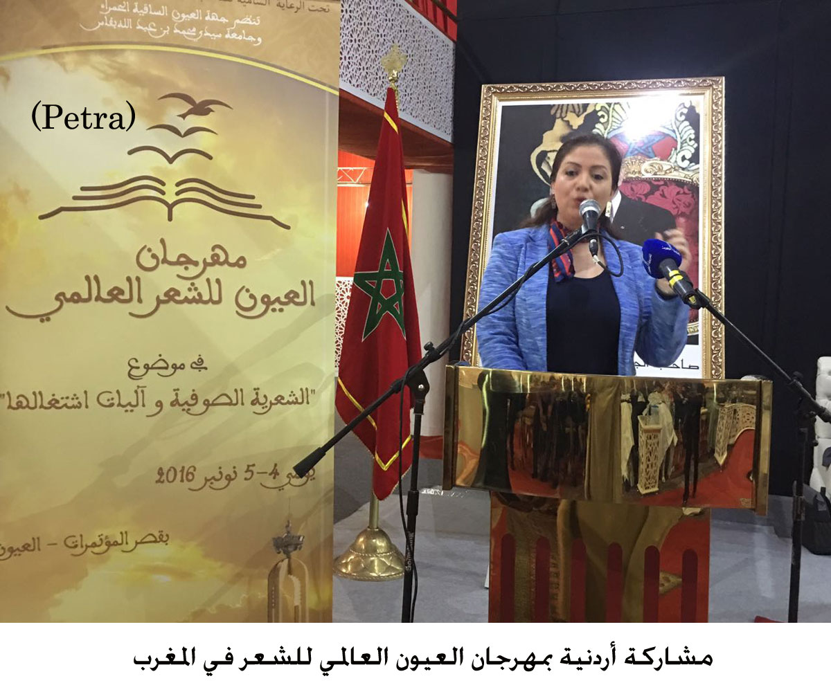 عمون - شارك عدد من الشعراء الأردنيين في مهرجان العيون العالمي الأول للشعر الذي نظمته ولاية الساقية الحمراء في المملكة المغربية بمدينة العيون الصحراوية بعنوان: "الشعرية الصوفية وآليات إشتغالها"، بالتعاون مع جامعة سيدي محمد بن عبد الله والمنظمة الاسلامية للتربية والعلوم والثقافة "الإيسسكو". وقدم الدكتور صلاح جرار والفنانة التشكيلية غدير حدادين ومحمد خضّير باقة منوعة من القصائد الشعرية الكلاسيكة، وأخرى تحمل أبعاداً إنسانية وفكرية عميقة، وبعض القصائد التي تتميز ببعدها الوطني والإنساني.