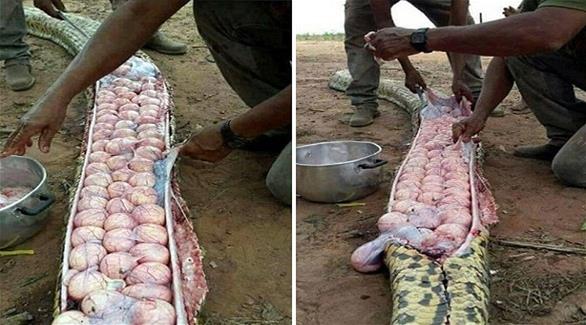 وذكرت وسائل إعلام محلية إن القرويين اتهموا الأفعى بالتهام ماشيتهم، وعمدوا إلى قتلها وشق بطنها، وكانت المفاجأة عندما اكتشفوا أنها حامل بالعشرات من البيض، وهذا ما تسبب في انتفاخ بطنها، بحسب صحيفة ديلي ميل البريطانية.