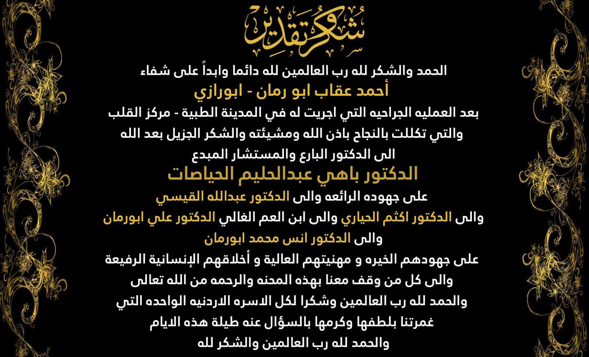 عمون - يتقدم احمد عقاب ابو رمان بجزيل الشكر لجميع العاملين في مركز القلب بمستشفى المدينة الطبية، ويخص بالذكر المستشار باهي عبدالحليم الحياصات والدكتور عبدالله القيسي والدكتور أكثم الحياري والدكتور علي ابو رمان والدكتور انس ابو رمان.