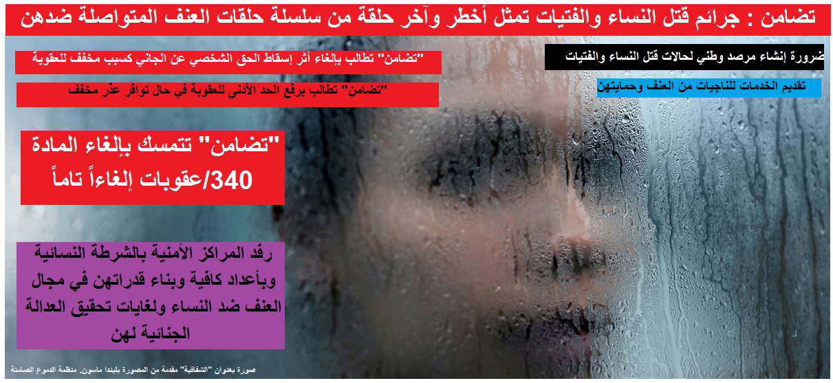 إن الأرقام التي أوردتها "تضامن" في بيانات سابقة حول عدد جرائم قتل النساء والفتيات والبالغة 28 جريمة منذ بداية العام الحالي حتى 21/11/2016 ، تقتصر فقط على الجرائم المرتكبة ضدهن لكونهن نساء وقد تكون الجرائم التي يرتكبها الجناة تذرعاً في "الشرف" أو "غسل العار" الصورة الأكثر وضوحاً في هذا المجال.