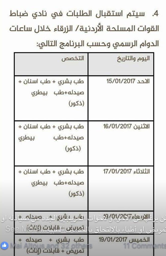 4. سيتم استقبال الطلبات في نادي ضباط القوات المسلحة الأردنية/ الزرقاء خلال ساعات الدوام الرسمي وحسب البرنامج التالي: