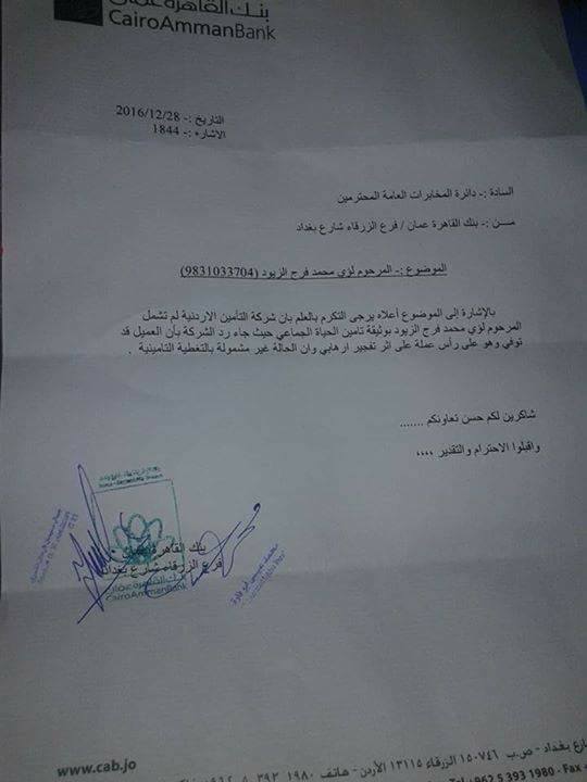 عمون - أوضحت ادارة بنك القاهرة عمان ان الكتاب الذي تم تداوله على مواقع التواصل الاجتماعي والمتعلق بمبلغ مالي مستحق على الشهيد لؤي محمد الزيود هو موجه للإفادة ان شركة التأمين قد رفضت دفع المطالبة. |