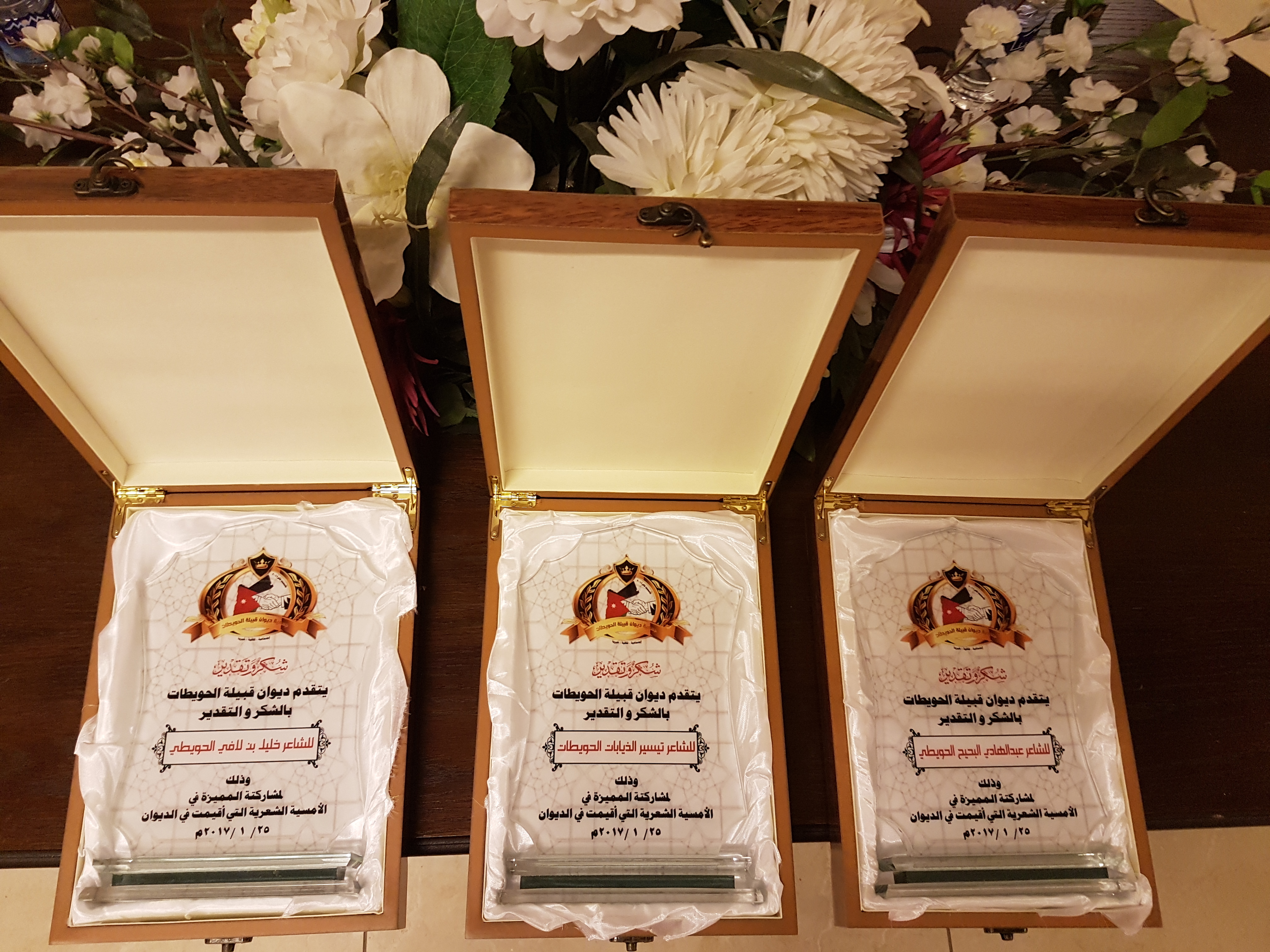 عمون - ضمن فعاليات ديوان قبيلة الحويطات الكائن في شارع الملك عبدالله الثاني بالقرب من شركة زين اقيمت يوم الاربعاء الموافق 25/1/2017 امسية شعرية في مقر الديوان لكل من الشعراء عبدالهادي البحيح الحويطي والشاعر خليل بن لافي الحويطي والشاعر تيسير بن ذياب الحويطي و وبحضور لافت وبتغطية اعلامية مميزة من قبل قناة سفن ستار (برنامج تعاليل) بإدارة الاعلامي المتميز الدكتور حسن المحارمة.