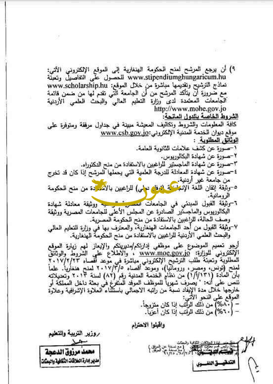 عمون - ينال المعاني - كشف مصدر مطلع في وزارة التربية والتعليم لـ عمون عن توفر منح دراسات عليا لموظفي الوزارة مقدمة من الحكومة التونسية للحصول على درجة الدكتوراة في مختلف التخصصات غير الطبية والعلمية بالاضافة لمنح مقدمة من الحكومة المصرية للحصول على درجة الدكتوراة ومن الحكومة الرومانية للحصول على درجتي الماجستير والدكتوراة ومن الحكومة الهنغارية للحصول على درجتي الماجستير والدكتوراة للعام الدراسي 2017/2018 في مختلف التخصصات . |