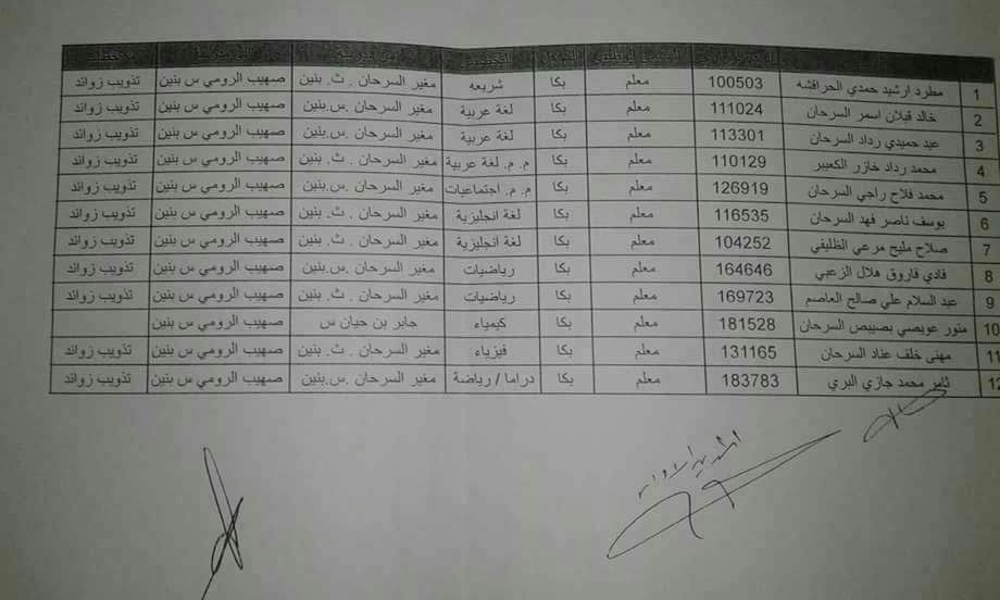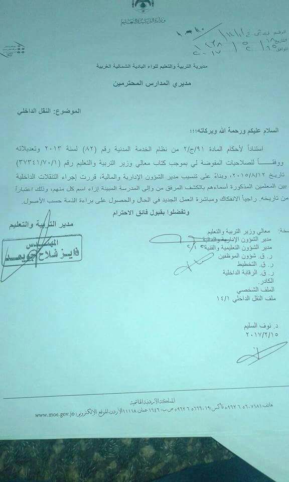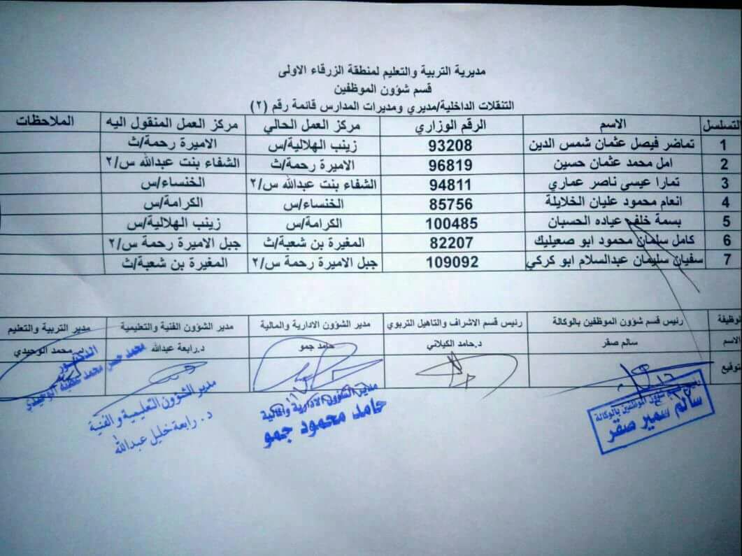 عمون - ينال المعاني - قرر مديري التربية والتعليم للواء البادية الشمالية الغربية ومنطقة الزرقاء الاولى اجراء تنقلات داخلية شملت معلمين ومدراء مدارس على النحو التالي: