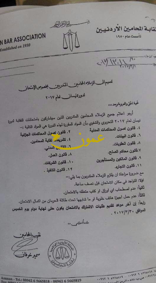 عمون - ينال المعاني - حددت نقابة المحامين الاردنيين المواد المقررة للمحامين المتدربين الذين سيشاركون بامتحان النقابة لدورة نيسان التحريري والشفوي لعام 2017.