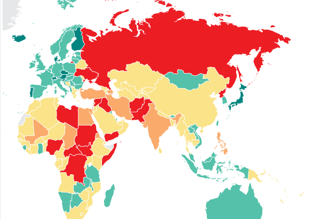 14.اليمن (المركز رقم 135 عالميًّا، بحصولها على درجة متوسطة بلغت 2.80).