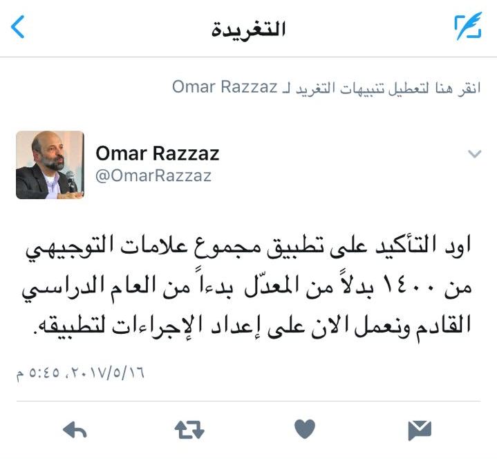 عمون - نشر وزير التربية والتعليم الدكتور عمر الرزاز اليوم الثلاثاء، تغريدة له على موقع التواصل الاجتماعي "تويتر" أكد فيها تطبيق مجموع علامات التوجيهي من ١٤٠٠ بدلاً من المعدّل بدءاً من العام الدراسي القادم. |