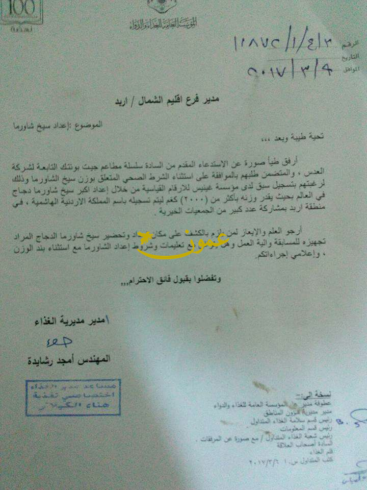 أرجو العلم بأن المؤسسة لم تقم بإعطاء الموافقة المطلوبة وان هناك طلب مقدم من أحد مطاعم الشاورما للسماح له بإعداد سيخ شاورما بوزن يتجاوز الوزن المسموح به من قبل المؤسسة لغايات الدخول الى موسوعة غينيس بمناسبة عيد الإستقلال وانها تقوم حاليا بدراسة الطلب المقدم لها بالتعاون مع جهات حكومية اخرى بالإضافة الى خبراء من موسوعة غينيس في مجال سلامة الغذاء للإلتزام بالشروط اللازمة من حيث الوزن والحرارة للحفاظ على مأمونية وسلامة الغذاء المقدم .