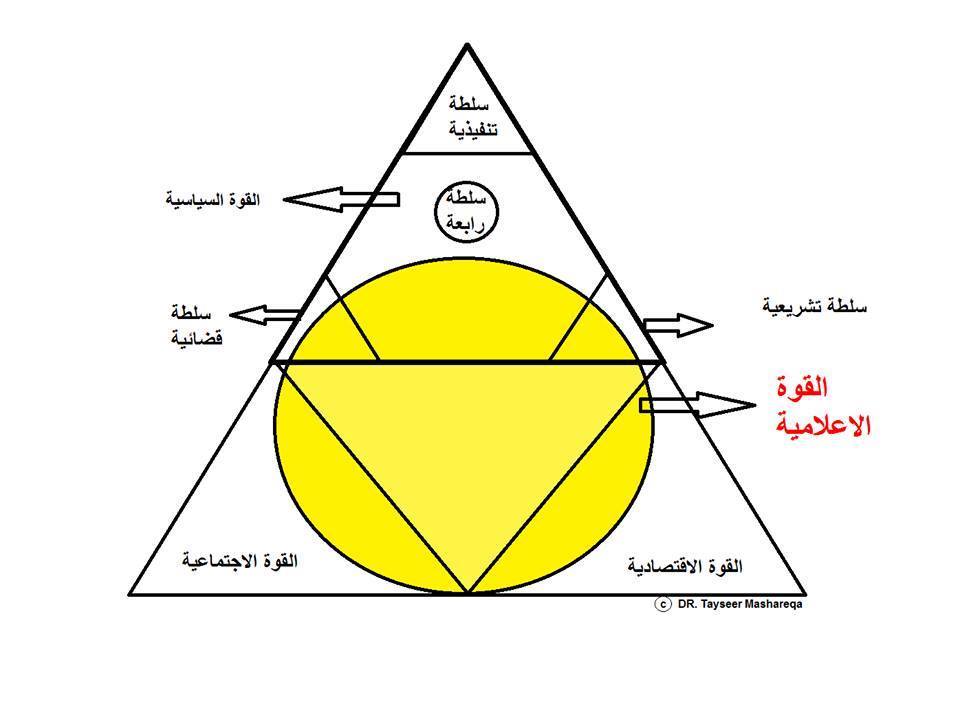 لم يعد الإعلام كما سبق متغوّلا عليه وضعيفا في دولة صغيرة تتكالب عليه السلطات الثلاث. السلطة الرابعة محشورة في زاوية الاتهام دائماً تدير أعمالها وزارات الدفاع. نحن بحاجة لسلطة خامسة. في واقعنا الحالي لم تعد هناك "سلطة إعلام رابعة" وإنما (قوة إعلامية) يتداخل نفوذها مع (القوة السياسية) و(القوة الاجتماعية) و(القوّة الاقتصادية)، في وقت تمّحي فيه السلطات الثلاث آنفة الذكر حسب منطق الفيلسوف الفرنسي مونتسكيو.