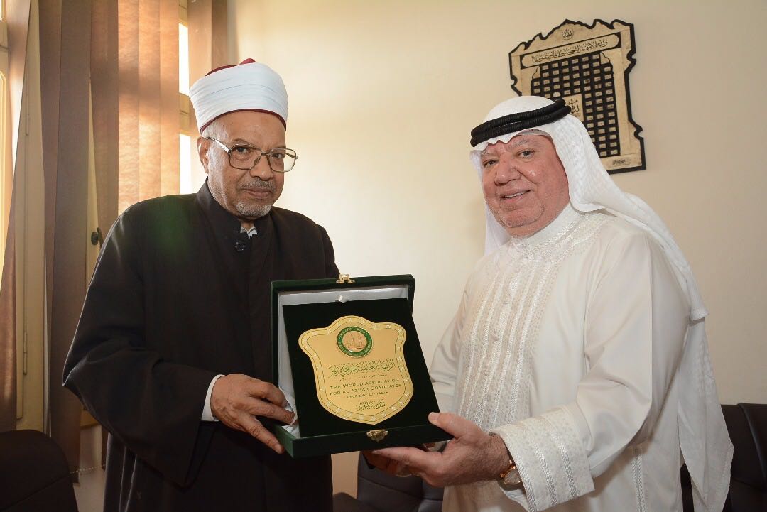 عمون - رحب الاستاذ الدكتور محمد عبد الفضيل القوصي نائب رئيس الرابطة العالمية لخريجي الازهر، ووزير الأوقاف الأسبق وصاحب المشروع الفكري الذي يجمع بين العقل والنقل اعتمادا على المدرسة الأشعرية الممثلة لأهل السنة والجماعة في جمهورية مصر العربية، بالكاتب الأردني الزميل احمد سلامة اثناء تكريمه بتسلم درع الرابطة في القاهرة.