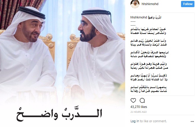 عمون - صاغ نائب رئيس دولة الإمارات، حاكم دبي محمد بن راشد آل مكتوم موقفه من الأزمة مع قطر في قصيدة لامس فيها مختلف أطراف القضية بأسلوب وجداني.
