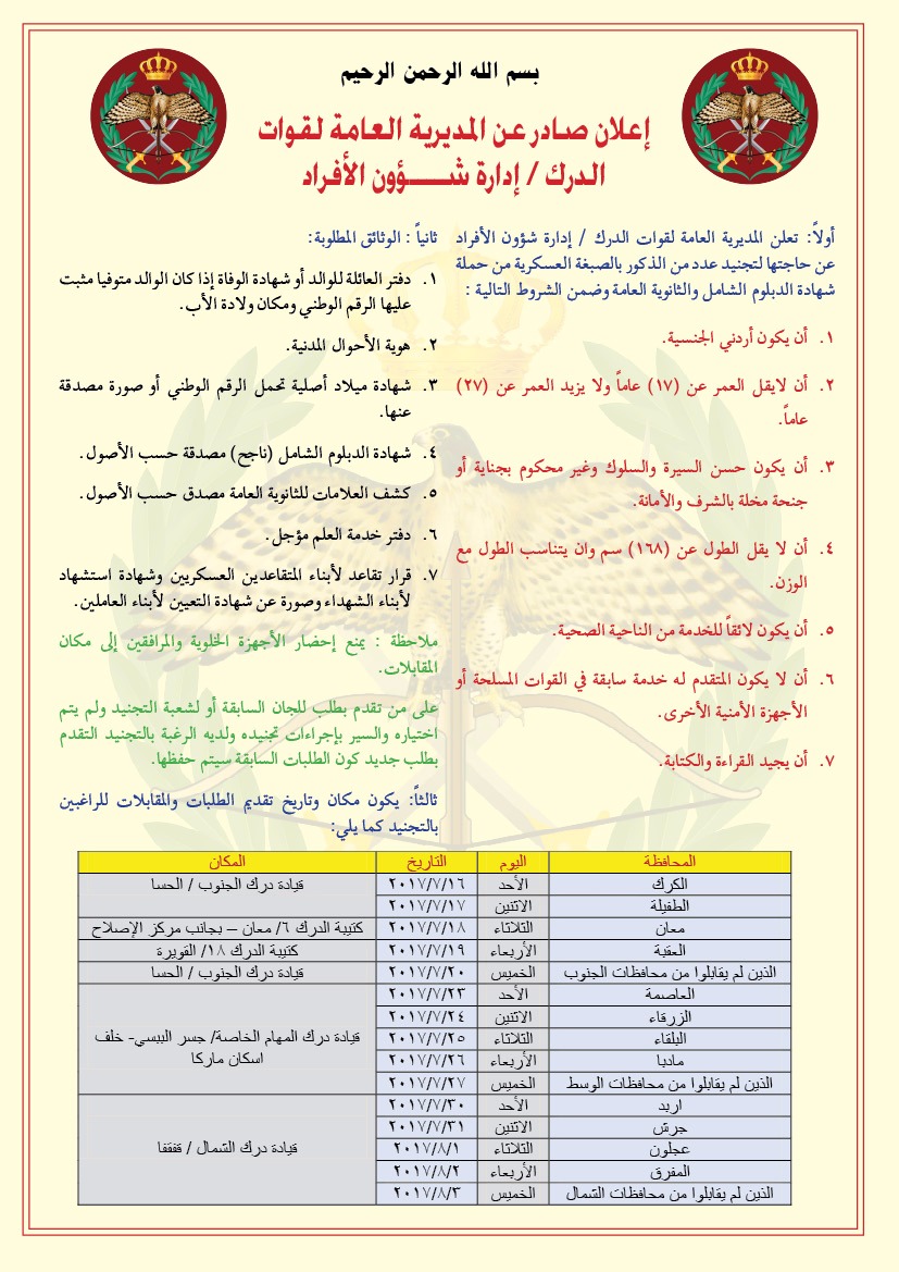 عمون - اعلنت المديرية العامة لقوات الدرك عن حاجتها لتجنيد عدد من الذكور بالصبغة العسكرية من حملة شهادة الدبلوم الشامل والثانوية العامة.