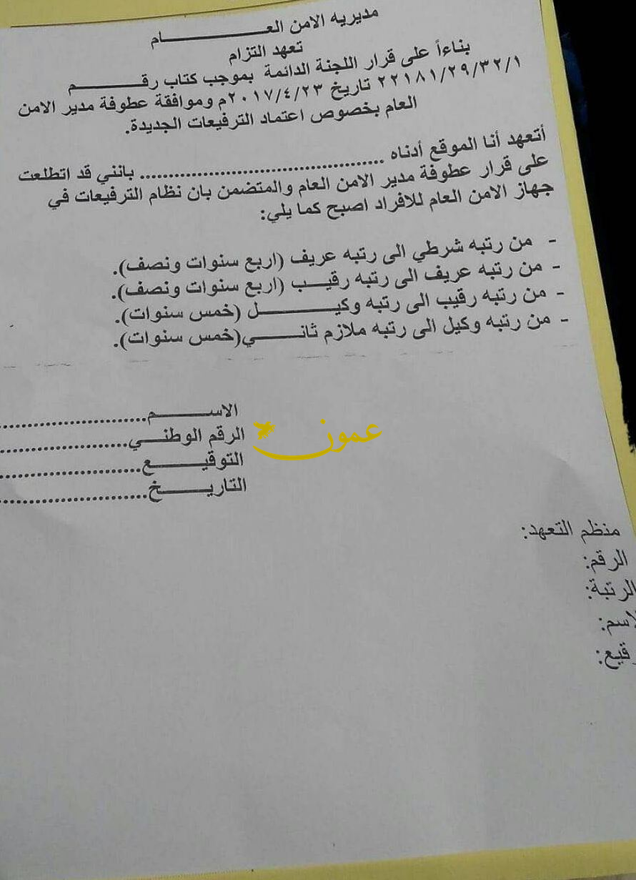 عمون - ينال المعاني - كشف مصدر مطلع في مديرية الامن العام لـ عمون عن قرار اتخذه مدير الامن العام اللواء احمد الفقيه بزيادة مدة الترفيع ستة أشهر للرتب من شرطي الى عريف ومن عريف الى رقيب وزيادة سنة للرتب من رقيب الى وكيل ومن وكيل الى وكيل اول او ملازم ٢.