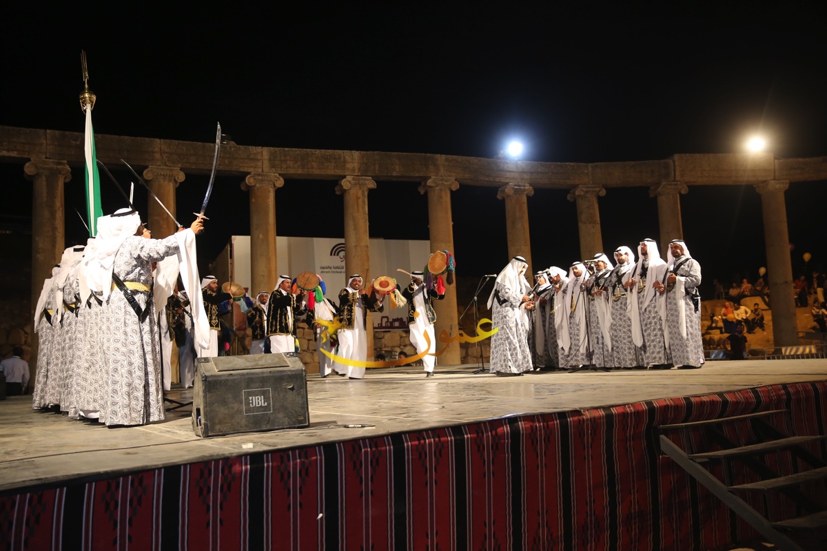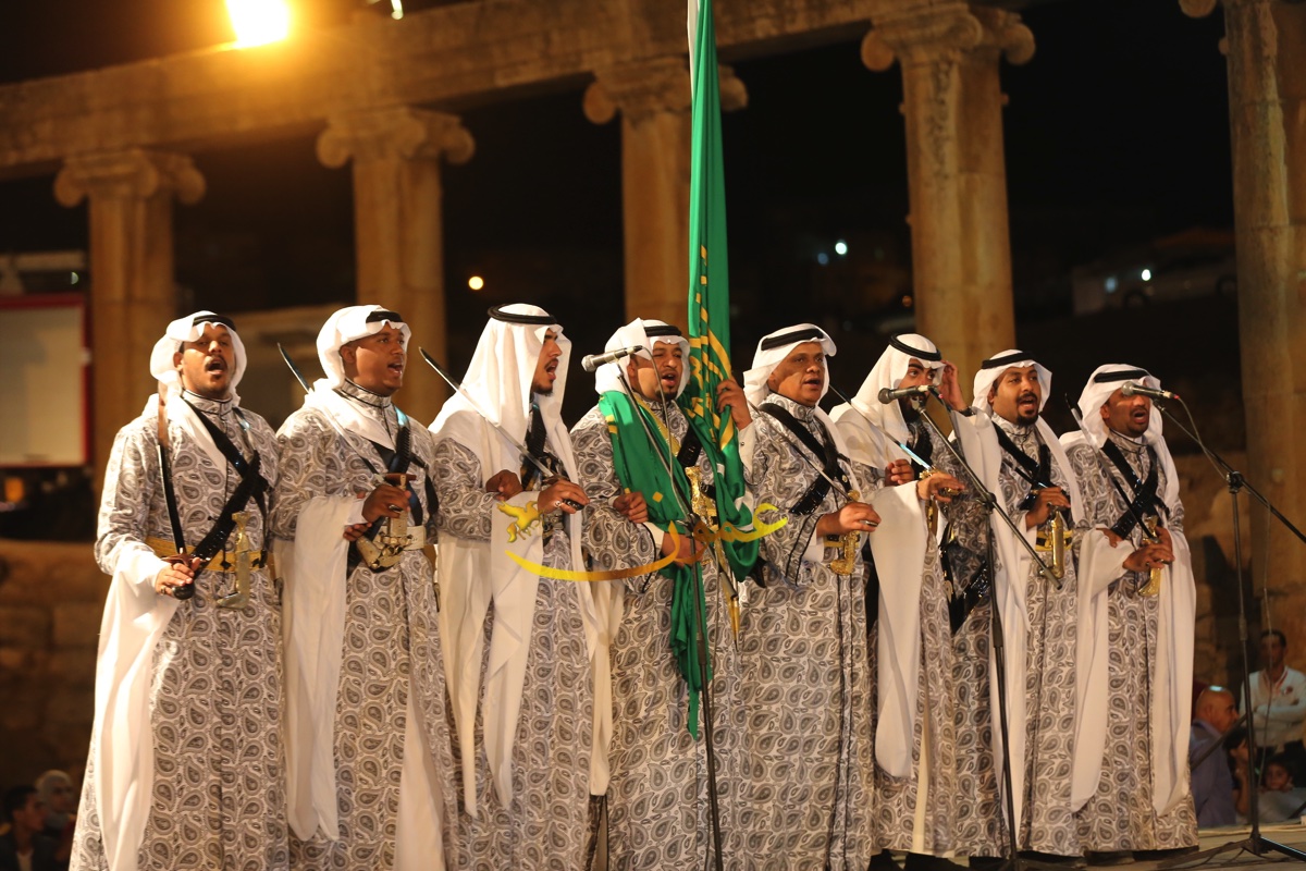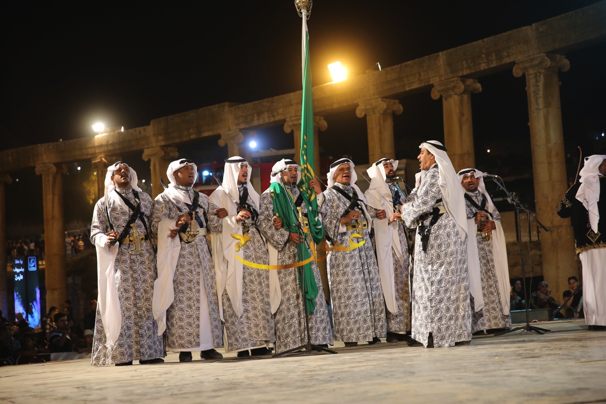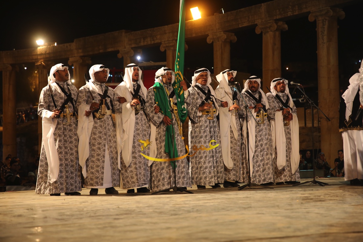 الفرقة التي شهدت حضورا كبيرا من الجمهور المحلي والعربي والاجنبي، وشاركها في احدى فقراتها محافظ جرش الدكتور رائد العدوان والملحق الثقافي السعودي في عمان راشد بن عبدالله النابت بالسيوف، أداء العرضة إلى جانب مجموعة المنشدين الـ 7 على الجهة اليسرى من الجمهور حيث يتوسطهم حامل الراية "البيرق" علم المملكة