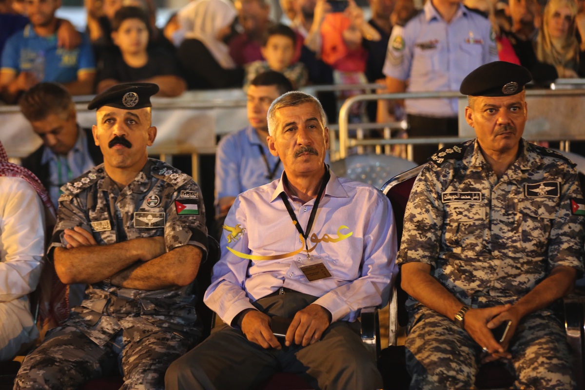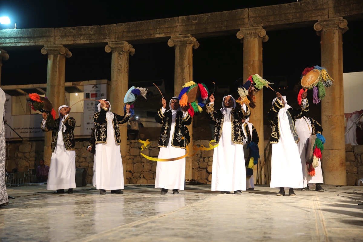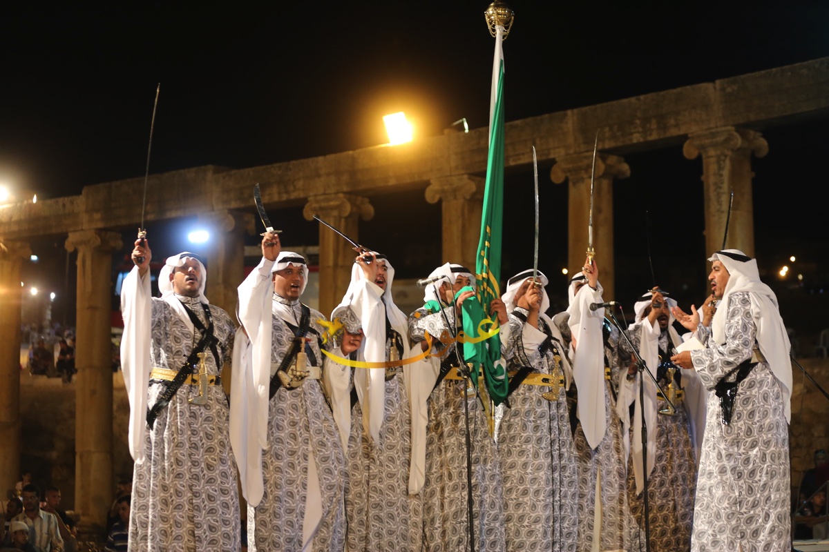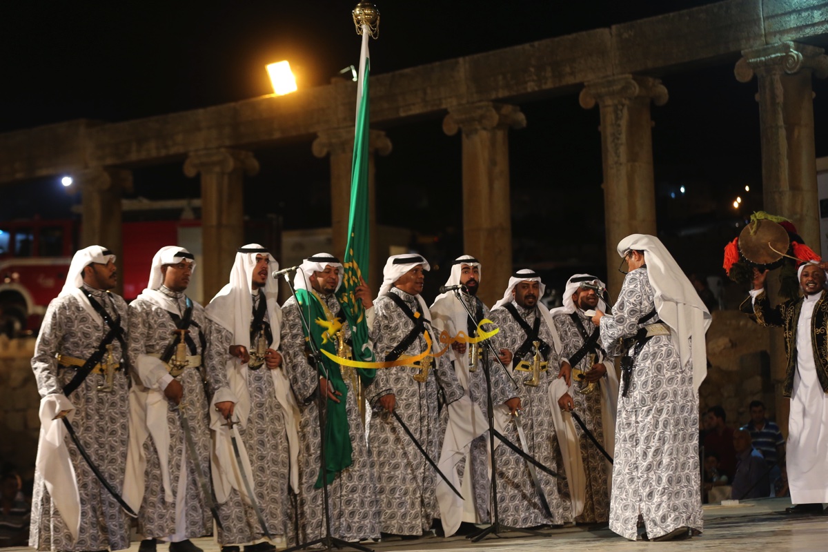 الفرقة التي شهدت حضورا كبيرا من الجمهور المحلي والعربي والاجنبي، وشاركها في احدى فقراتها محافظ جرش الدكتور رائد العدوان والملحق الثقافي السعودي في عمان راشد بن عبدالله النابت بالسيوف، أداء العرضة إلى جانب مجموعة المنشدين الـ 7 على الجهة اليسرى من الجمهور حيث يتوسطهم حامل الراية "البيرق" علم المملكة
