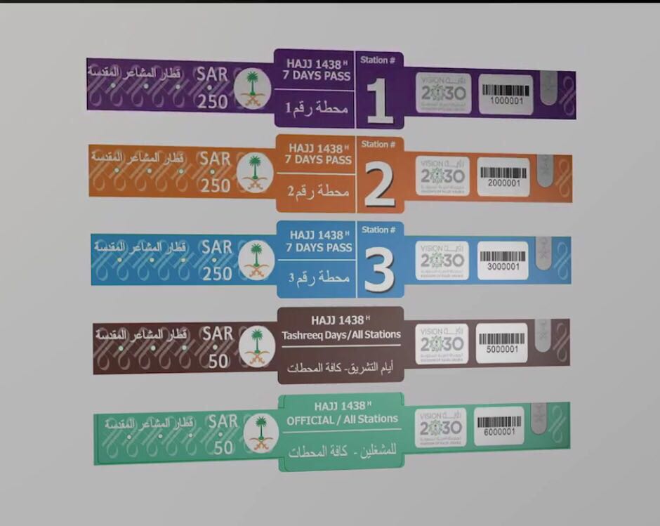وقسمت التذاكر الى خمسة فئات لكل فئة لون مختلف عن الأخريات اما اللون البنفسجي فيتيح لحامله استخدام محطات منى 1 ومزدلفة 1 وعرفات 1 ، اما اللون البرتقالي فيتيح لحامله استخدام محطات منى 2 ومزدلفة 2 وعرفات2 ، واللون الأزرق فحامله يستخدم محطات منى 3 ومزدلفة 3 وعرفات 3 واللون البني فيتيح لحامله استخدام كافة المحطات ايّام التشريق فقط، اما اللون الأخضر فيقتصر استخدامه على المشغلين فقط لكافة المحطات.