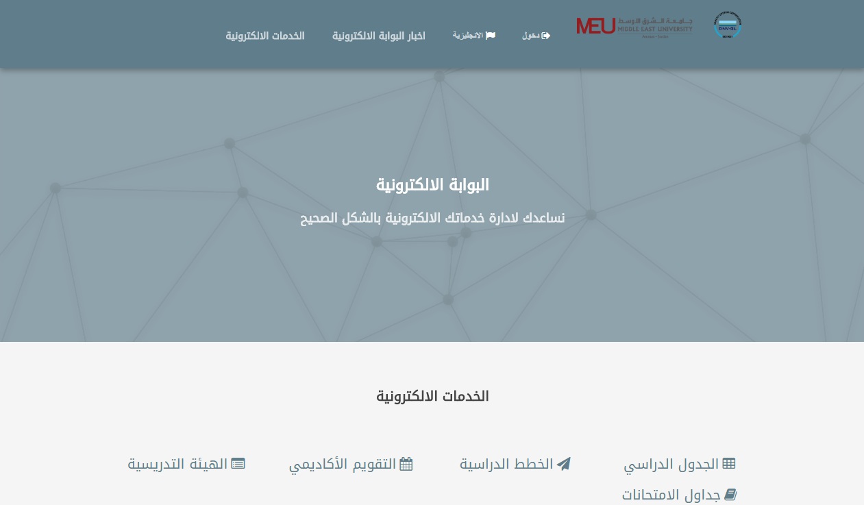 وتتميز البوابة الإلكترونية، ورابطها من خلال الموقع الالكتروني – البوابة الإلكترونية http://reg.meu.edu.jo، بالبساطة والسهولة وجودة الخدمات، وتتيح لجميع زائريها خمس نوافذ تتوزع بين: الجدول الدراسي، التقويم الاكاديمي، والخطط الدراسية، والهيئة التدريسية، جداول الامتحانات، واضافة الى ذلك أخبار البوابة الإلكترونية ، وتقييم الخدمات المقدمة.