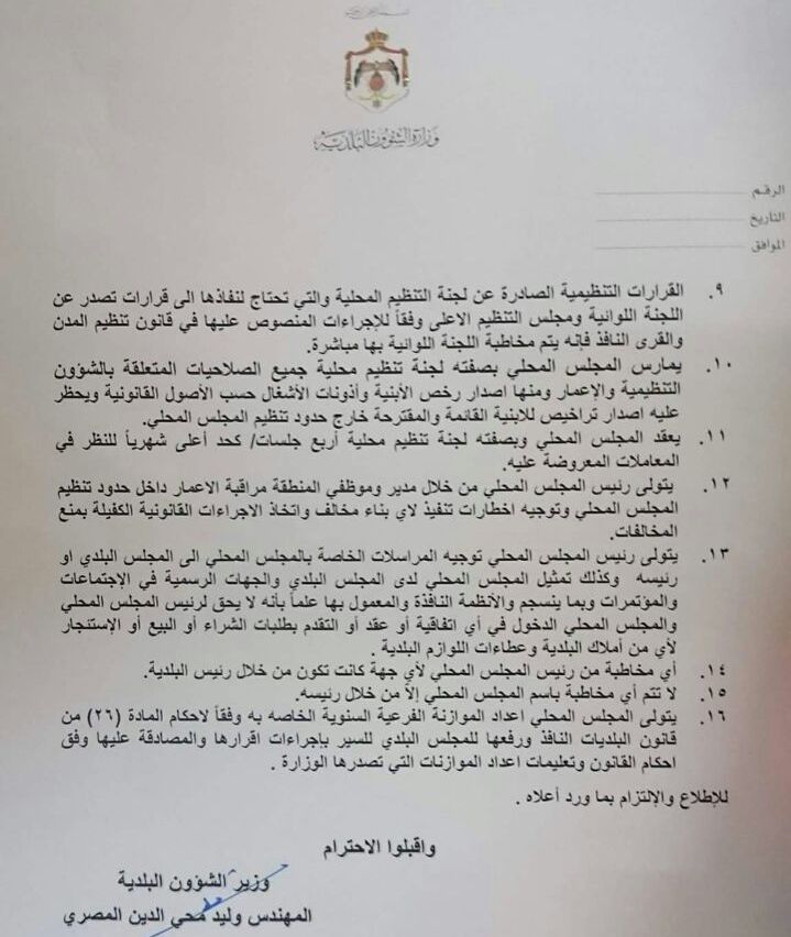 عمون - ينال المعاني - اصدر وزير الشؤون البلدية المهندس وليد المصري لائحة مهام وواجبات رؤساء المجالس المحلية واعضائها استنادا لأحكام المواد ذوات الارقام (٤،٦،٨) من قانون البلديات رقم (٤١) لسنة ٢٠١٥ وتعديلاته.