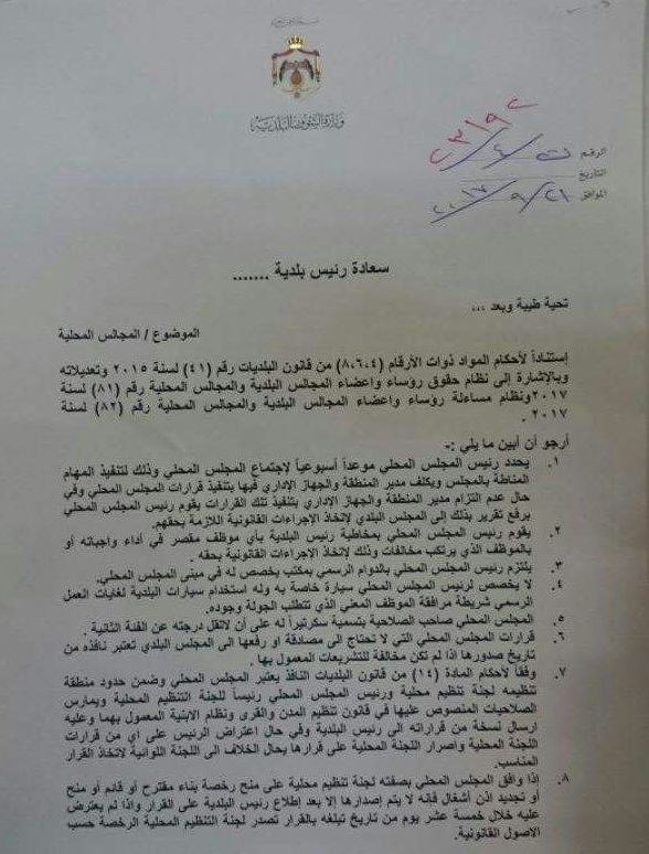 وبالإشارة الى نظام حقوق رؤساء واعضاء المجالس البلدية والمجالس المحلية رقم (٨١) لسنة ٢٠١٧ ونظام مساءلة رؤساء واعضاء المجالس البلدية والمجالس المحلية رقم (٨٢) لسنة ٢٠١٧ وعلى النحو التالي:
