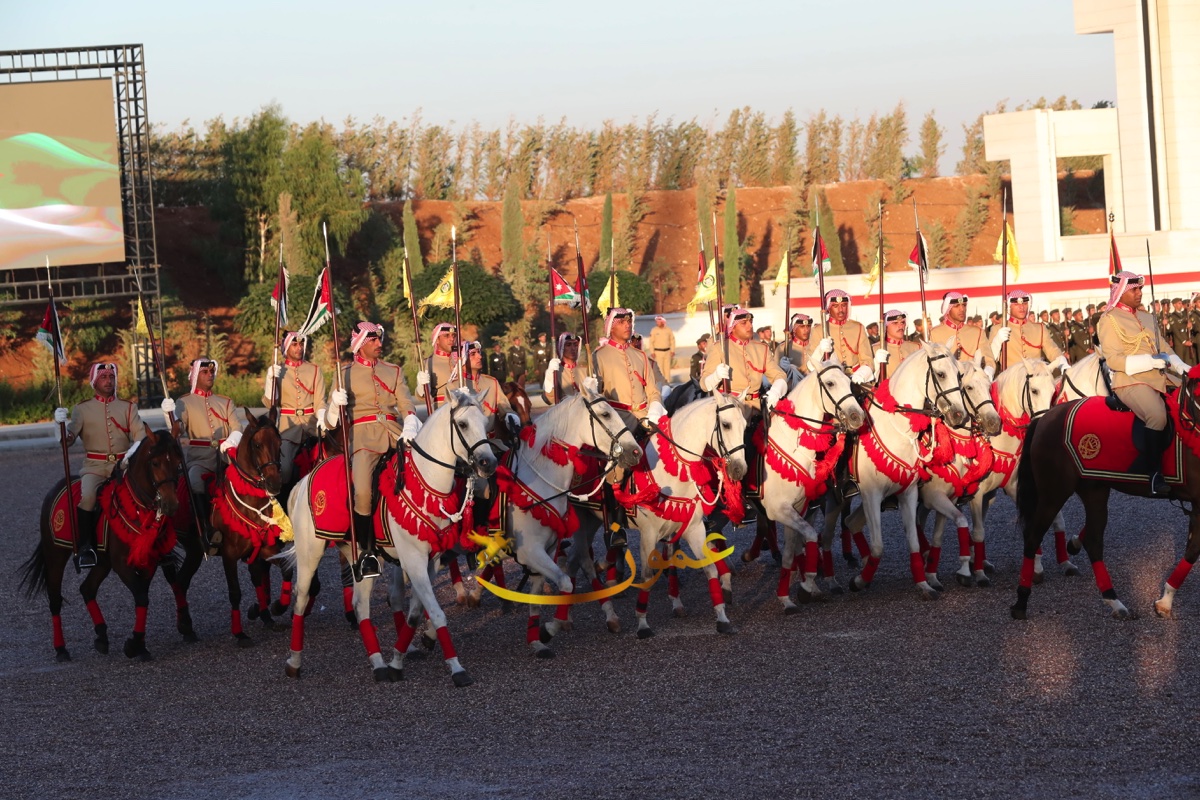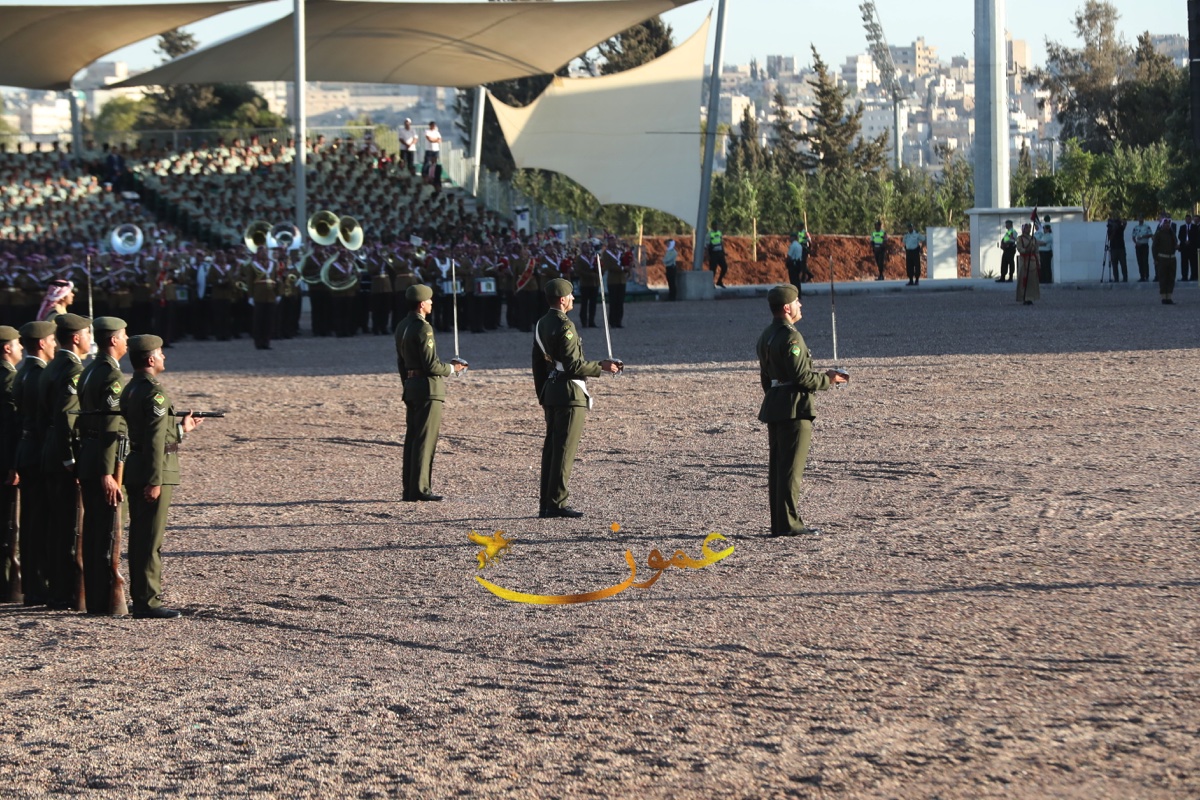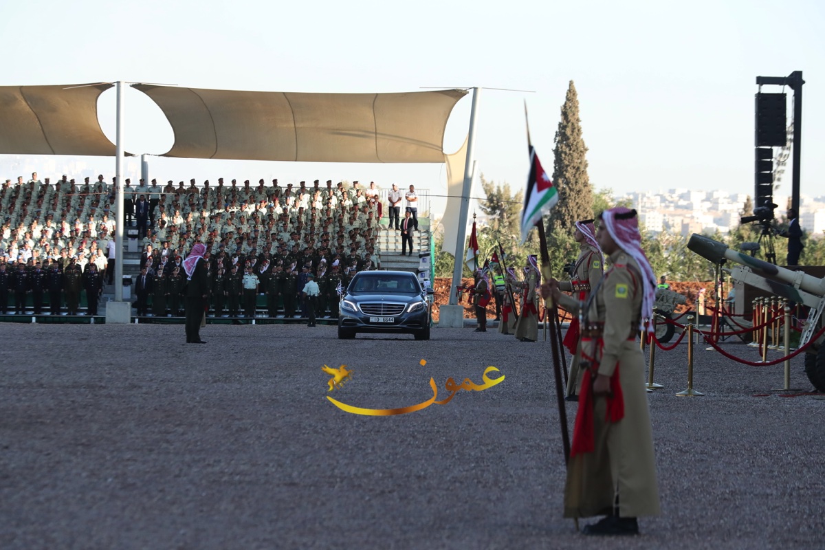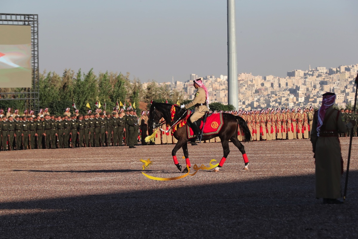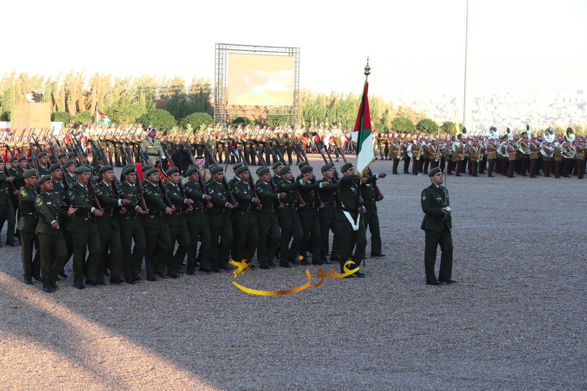ولدى وصول جلالة القائد الأعلى ميدان الراية مستقلا الموكب الملكي الأحمر وتحيطه كوكبة من الفرسان، أطلقت المدفعية إحدى وعشرين طلقة تحية لجلالته، وكان في استقباله رئيس هيئة الأركان المشتركة الفريق الركن محمود عبدالحليم فريحات.