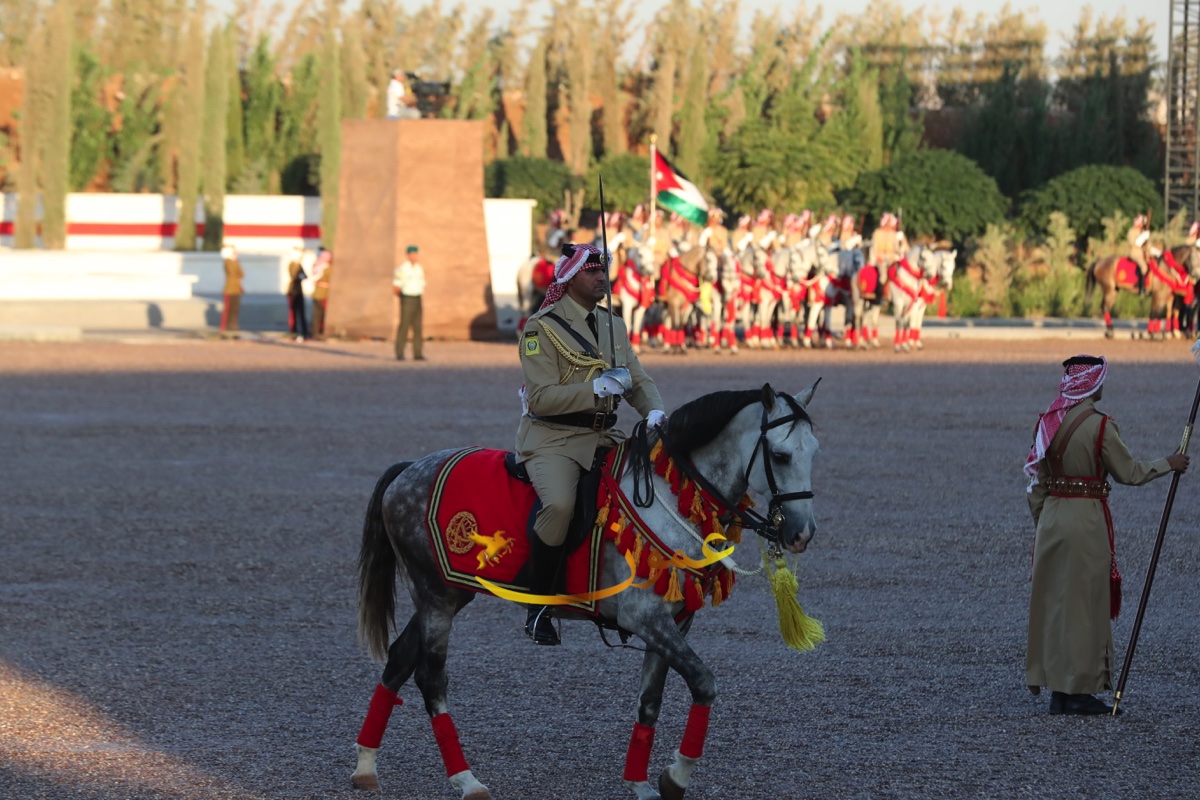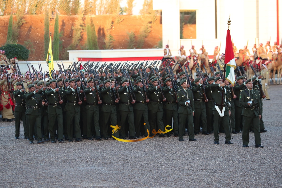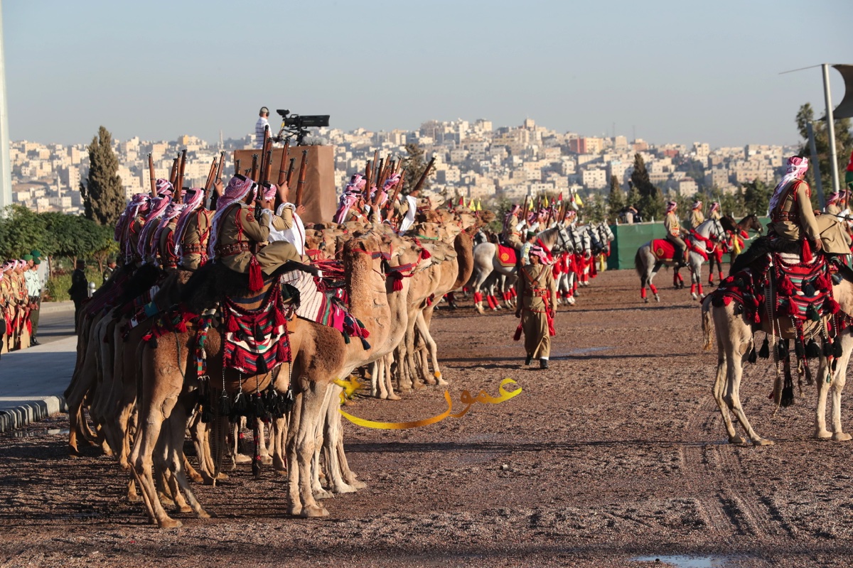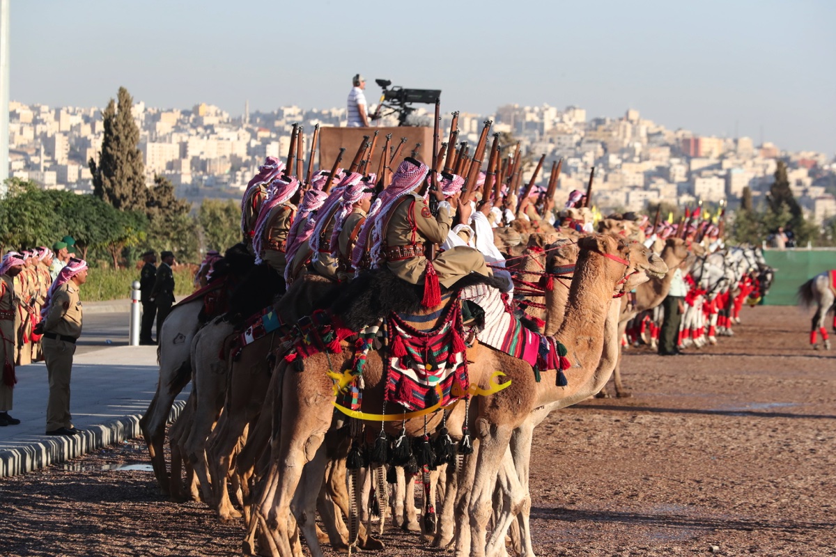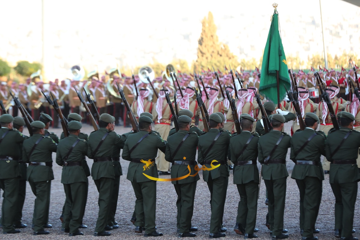 ولدى وصول جلالة القائد الأعلى ميدان الراية مستقلا الموكب الملكي الأحمر وتحيطه كوكبة من الفرسان، أطلقت المدفعية إحدى وعشرين طلقة تحية لجلالته، وكان في استقباله رئيس هيئة الأركان المشتركة الفريق الركن محمود عبدالحليم فريحات.
