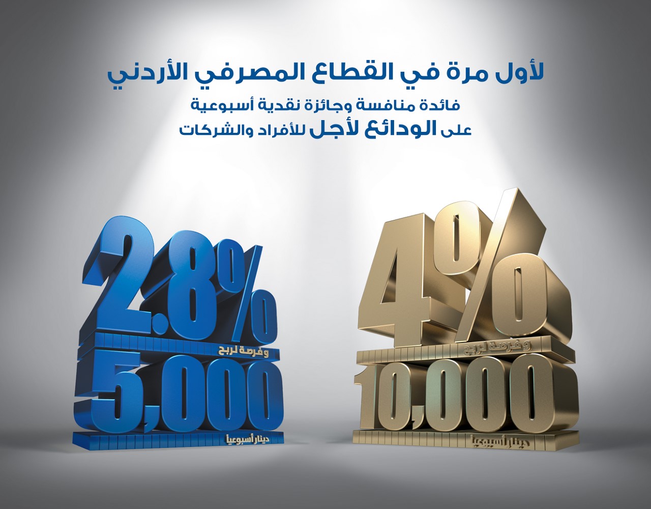 وينقسم برنامج الجوائز إلى شريحتين للودائع لأجل الجديدة حيث يبلغ الحد الأدنى للودائع لأجل ضمن الشريحة الأولى 100 ألف دينار بحد أدنى ولغاية أقل من 250 ألف دينار وبمدة ربط 60 يوماً، وبها يحصل المودع الجديد على سعر فائدة مميز يبلغ (2.8 %)، مع المشاركة بالسحب على جائزة نقدية مقدارها 5 الاف دينار يجري السحب عليها أسبوعياً، أما الشريحة الثانية فيبلغ الحد الأدنى للاشتراك بها 250 ألف دينار فأكثر وبمدة ربط 60 يوماً ويحصل المودع الجديد على سعر فائدة مميز يبلغ 4% مع المشاركة بالسحب على جائزة نقدية أسبوعية تبلغ 10 الاف دينار.