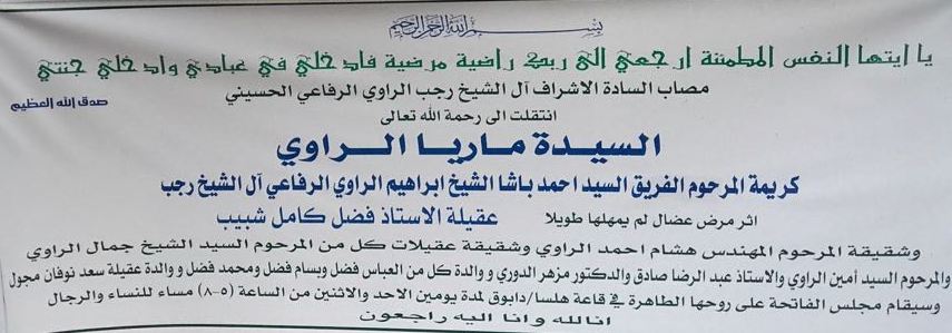 عمون - انتقلت الى رحمة الله تعالى السيدة ماريا الراوي، كريمة المرحوم الفريق احمد الشيخ ابراهيم الراوي الرفاعي ال الشيخ ال رجب.