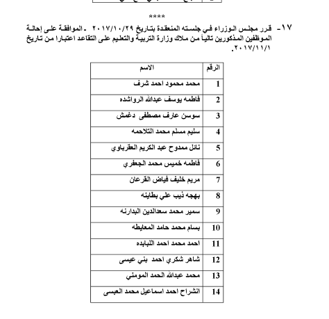 عمون- وافق مجلس الوزراء على احالة 116 موظفا من كوادر التربية على التقاعد اعتبارا من الأول من الشهر الجاري. |