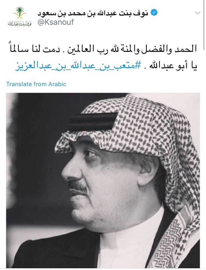 وقالت نوف بنت عبد الله: "الحمد والفضل والمنة لله رب العالمين. دمت لنا سالماً يا أبو عبدالله"، ولم يصدر حتى اللحظة تأكيد رسمي من السلطات السعودية، إلا أن بعض المصادر تحدثت عن مغادرة الأمير متعب لفندق "الريتز كارلتون"، حيث يتم احتجاز الموقوفين في حملة مكافحة الفساد.