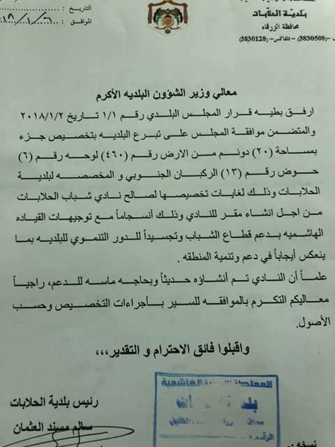 عمون - ينال المعاني - قرر مجلس بلدي الحلابات الموافقة على التبرع بتخصيص 20 دونما لصالح نادي شباب الحلابات من اجل انشاء مقر للنادي.