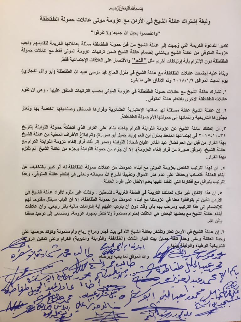 كما اكد الحضور على حرص عشيرة الطقاطقة على الاستمرار بالعلاقات الوطيدة التي تجمع جميع ابناء بيت فجار ومراح رباح وأم سلمونه في فلسطين والأردن والعمل سويا مع ابناء العمومة من عشيرة الديرية والثوابته والطقاطقة على الارتقاء بالمنجزات العظيمة التي حققها رجالات بيت فجار على مدى العقود الماضية.