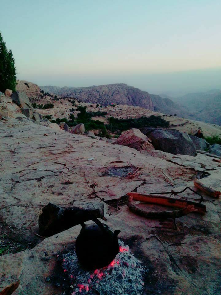 في الصورة المرفقة والملتقطة من احدى اطلالات منطقة ضانا في محافظة الطفيلة شاي يغلى على نار الحطب وابريقا انضجت النار بمرور الايام حديده فطلته باللون الاسود والذي يسمى في اللهجة العامية "السخام".