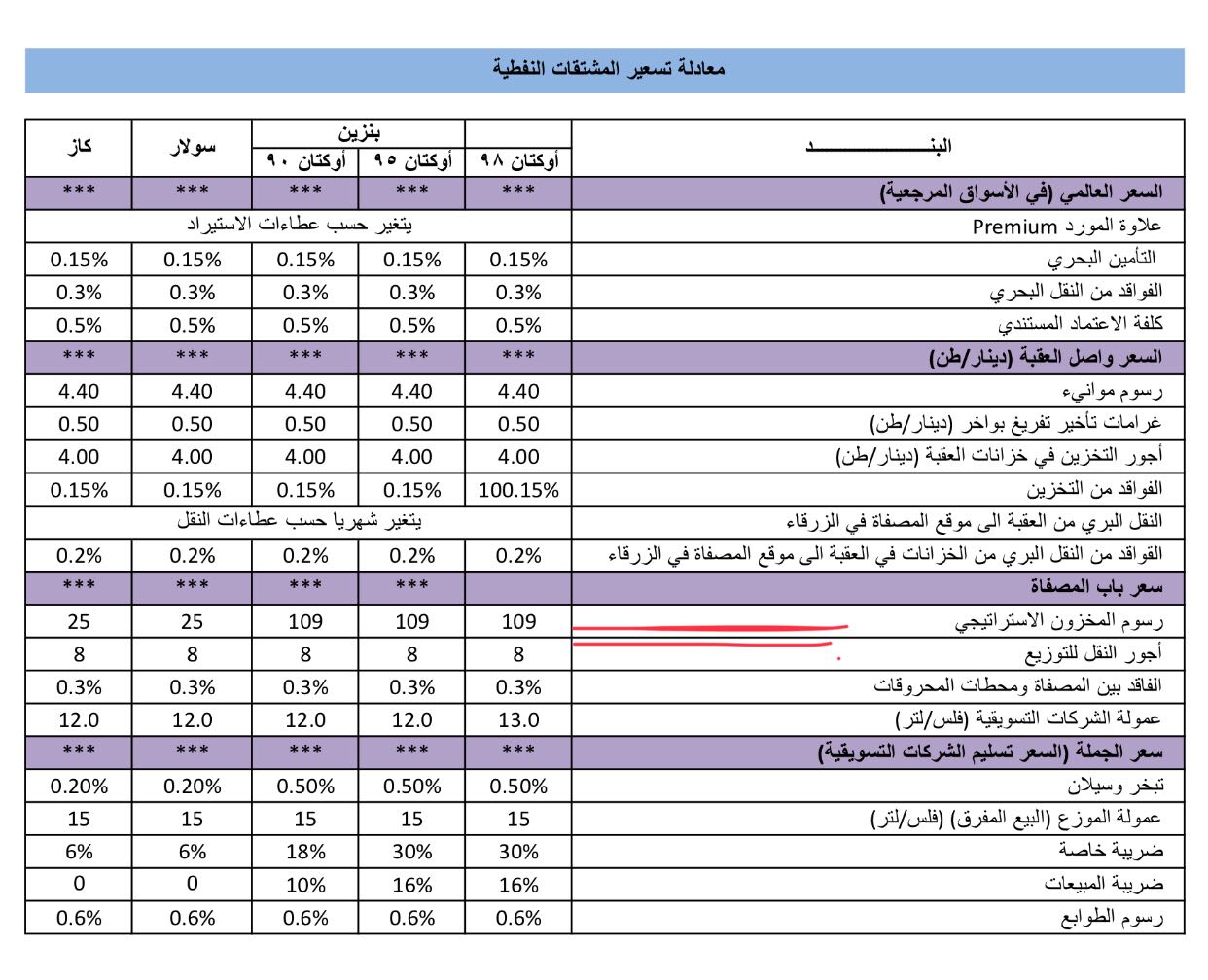 1 -(رسوم المخزون الإستراتيجي) والمحدد ب (109د/طن بنزين 90 و 95) و(25د/طن سولار وكاز) وذلك حسب معادلة تسعير المشتقات النفطيه سيئة الذكر وتقدر عوائد هذه الرسوم بحوالي (205 مليون دينار) سنويا.