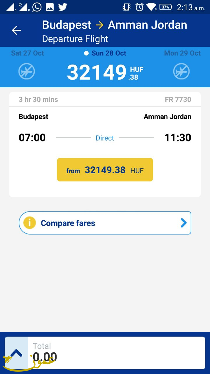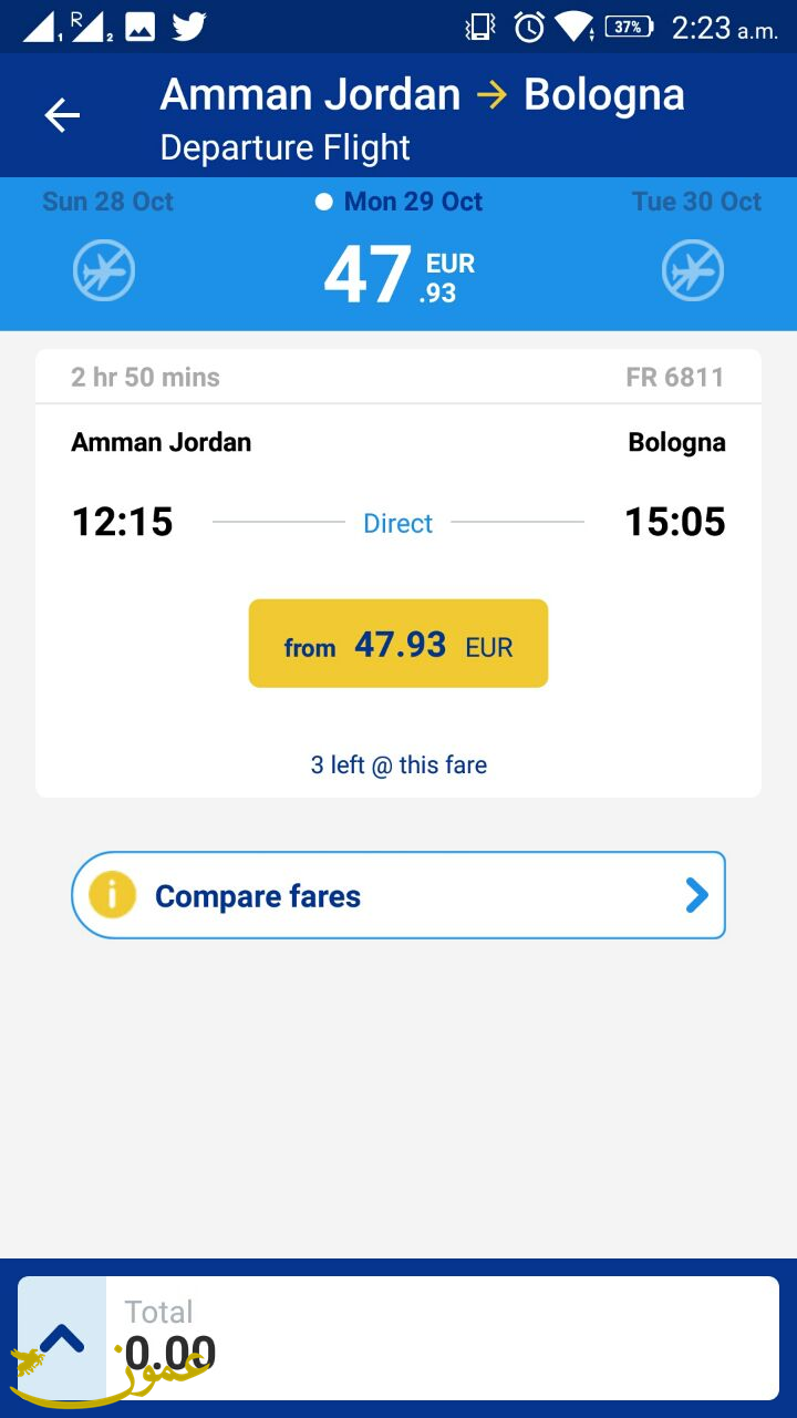 عمون - متابعة - اظهر تطبيق شركة الطيران راين اير التي اعلنت في وقت سابق من هذا العام عن افتتاح خط سفر من عدة وجهات اوروبية الى عمان (ذهاب اياب) ان الحجز بدأ الى رحلات عمان، وبحسب ما يظهر التطبيق فإن اولى الرحلات ستبدأ بنهاية شهر اكتوبر من العام الحالي حيث يمكن لمستخدمي التطبيق حجز تذاكر بأسعار تنافسية تختلف من وجهة لأخرى ومن تاريخ الى اخر، رحلة بودابست عمان يبدأ الحجز الأول لها في 28 من اكتوبر بسعر يصل الى 100 يورو تقريباً، في حين رحلة بولونيا ايطاليا الى عمان تبدأ بـ 48 يورو. |