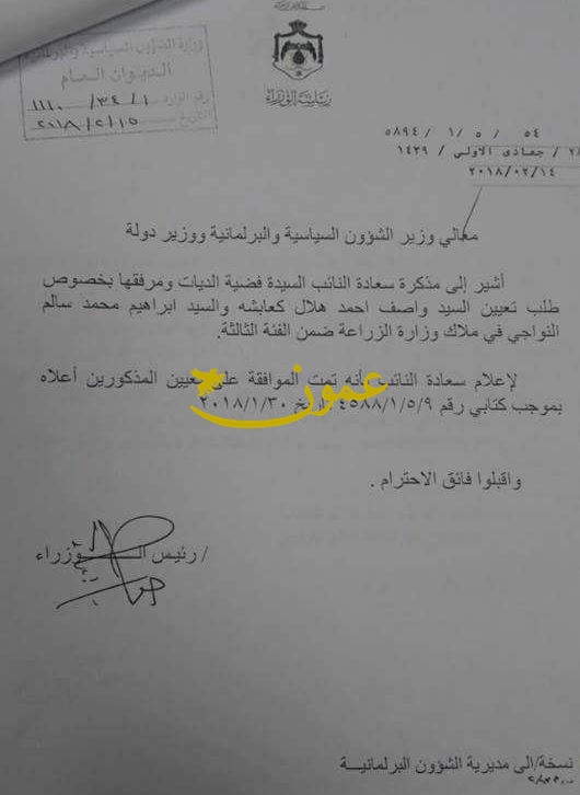 عمون - ينال المعاني - وجه رئيس الوزراء الدكتور هاني الملقي كتابا الى وزير الشؤون السياسية والبرلمانية ووزير دولة بتاريخ 14-2، لإعلام النائب فضية الديات بموافقته بخصوص تعيين موظفين في ملاك وزارة الزراعة ضمن الفئة الثالثة.